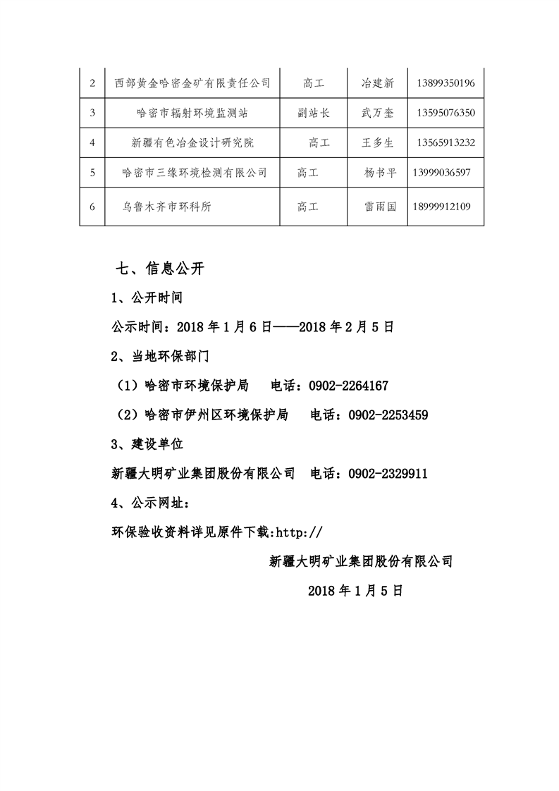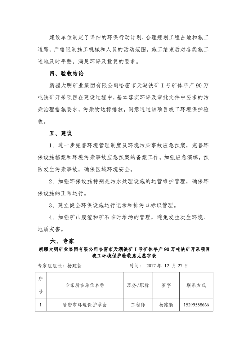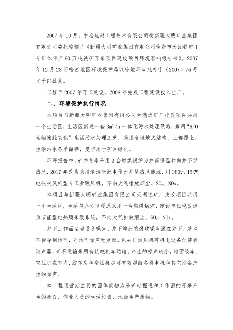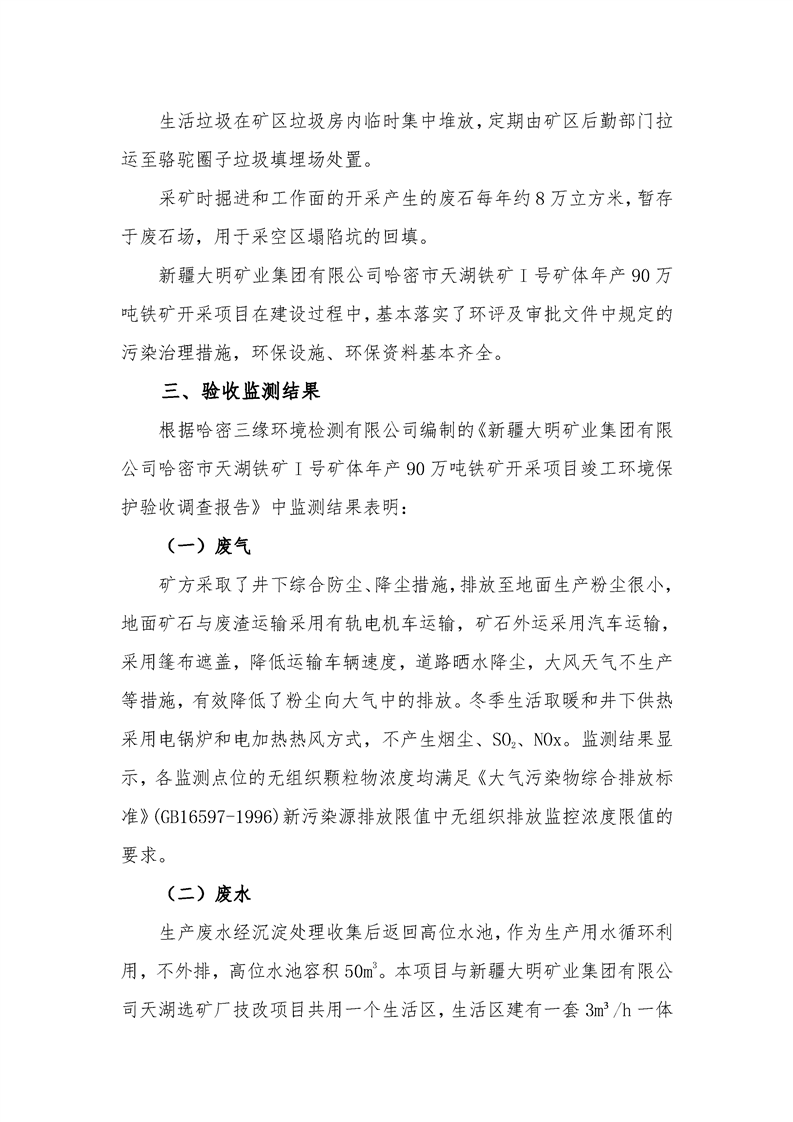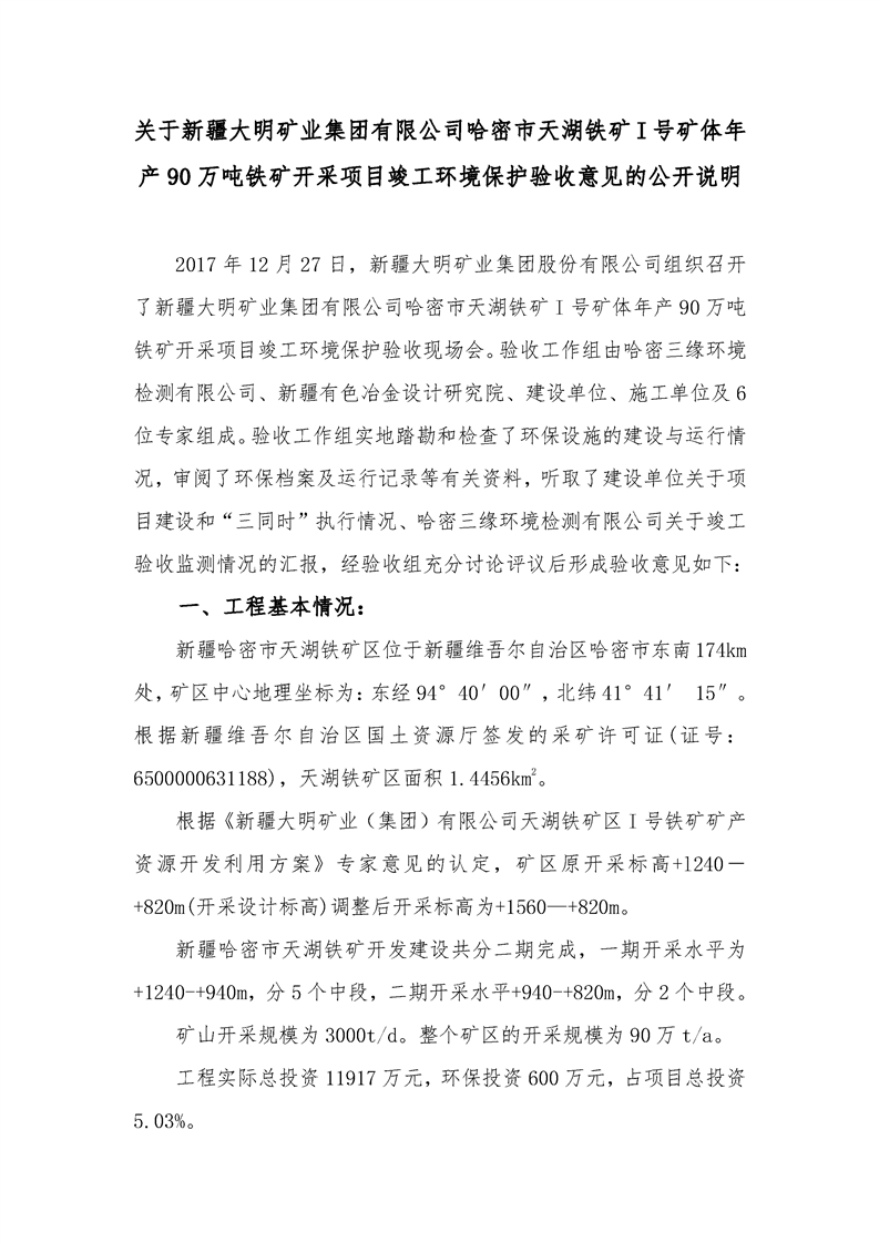 關于新疆大明礦業集團有限公司哈密市天湖鐵礦I號礦體年產90萬噸鐵礦開采項目竣工環境保護驗收意見的公開說明