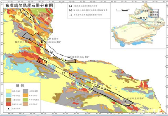 東準噶爾超大型晶質石墨位于準格爾盆地,擁有達布遜、孔克熱、吐而庫里、黃羊山2號、散的克等無處大型晶質石墨礦,初步勘探顯示,遠景儲量超過1億噸,固定碳平均品位約為10%,石墨多為晶質鱗片狀和葉片狀,達到優質級別。