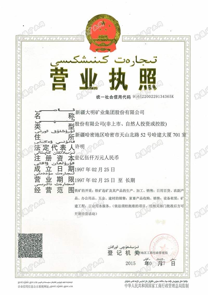 | 發(fā)證機(jī)構(gòu): | 哈密地區(qū)工商行政管理局 | 發(fā)證時(shí)間 : | 2015-10-27 |