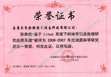 榮譽(yù)資質(zhì) 2006-2007年度新疆地礦局地質(zhì)科學(xué)研究成果一等獎(jiǎng)