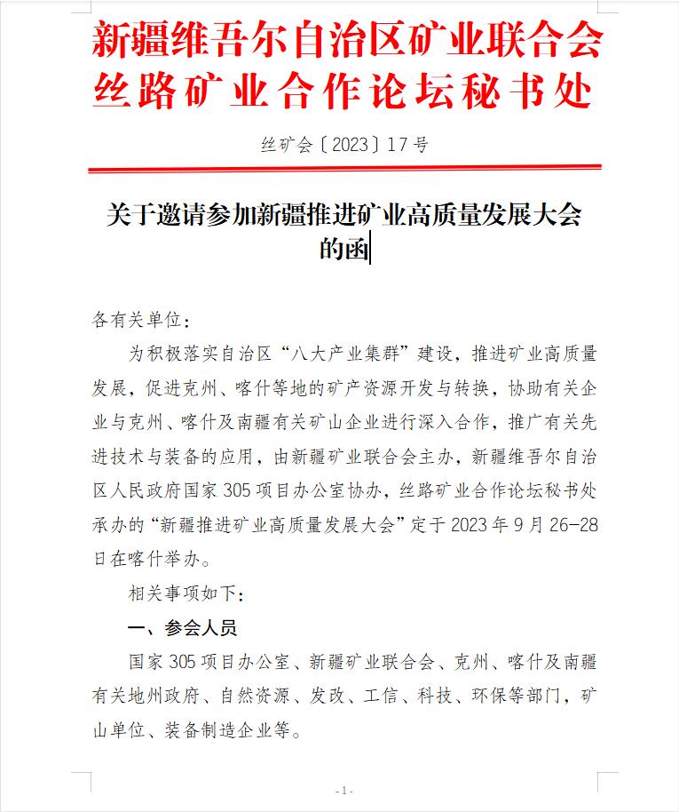 關(guān)于邀請參加新疆推進(jìn)礦業(yè)高質(zhì)量發(fā)展大會 的函