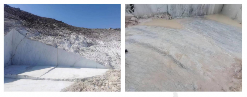 3號(hào)大理巖礦體位于礦區(qū)的西部。礦體平面上呈北西-南東向延伸,長(zhǎng)軸方向58°,長(zhǎng)度172米,寬36~53米,產(chǎn)狀135°~146°∠68°~79°。總體看,礦石完整性好,色差小,其完整性、顏色基本穩(wěn)定。